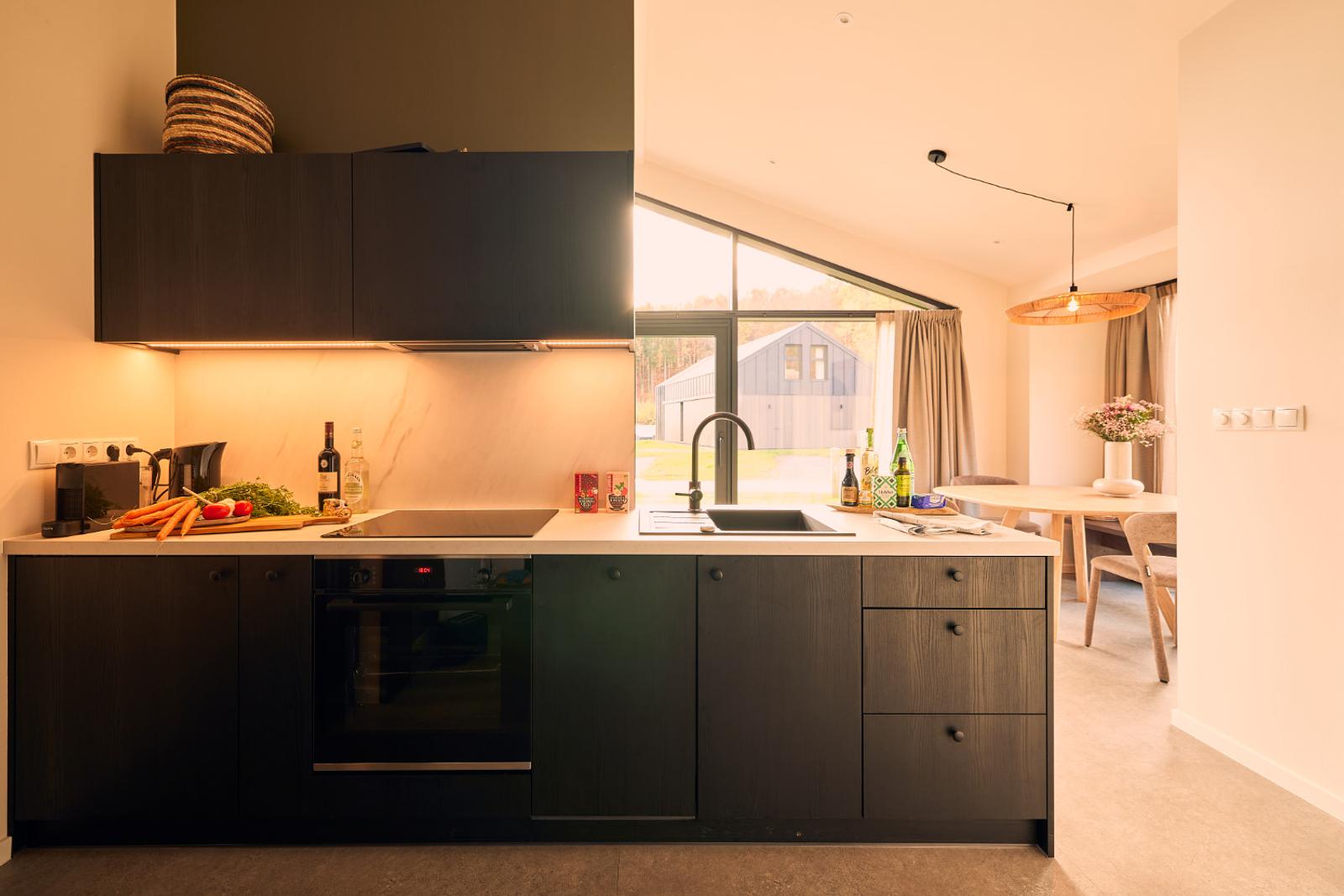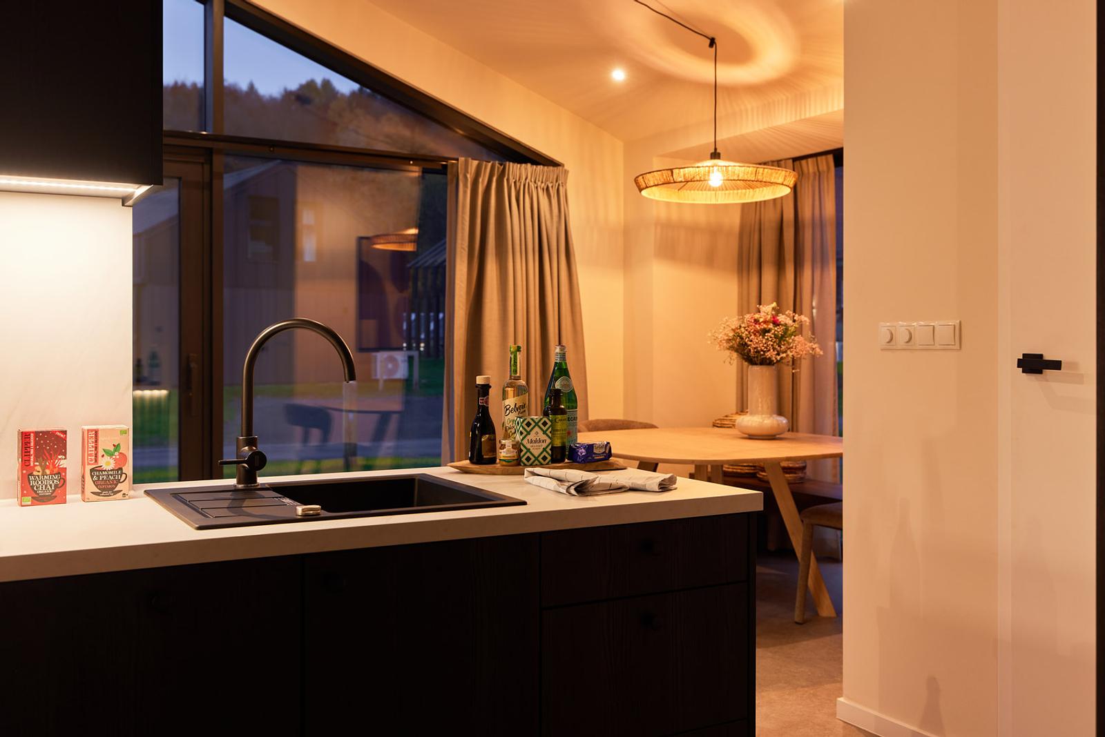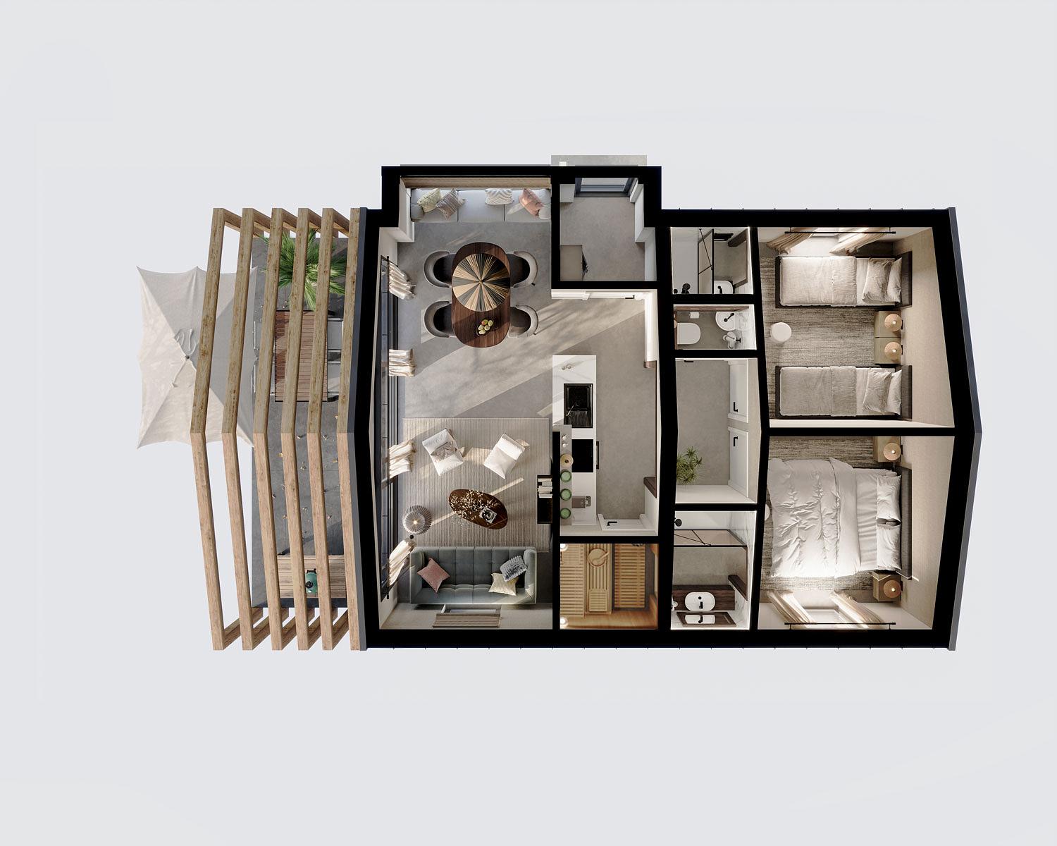 Die Eco Lodge für 4 Personen verfügt über zwei getrennte Schlafräume, die jeweils über ein eigenes luxuriöses Bad verfügen und somit ein Höchstmaß an Privatsphäre und Bequemlichkeit gewährleisten. Eines der beiden Zimmer ist mit einer geräumigen Sauna ausgestattet. Egal, ob Sie mit der Familie oder mit Freunden übernachten, jeder kann sich in seinen eigenen komfortablen Bereich zurückziehen. Das geräumige Wohnzimmer und die offene Küche sind das Herzstück der Lodge. Hier können Sie sich entspannen, gemeinsam kochen oder gute Gespräche mit Blick auf die Natur genießen.